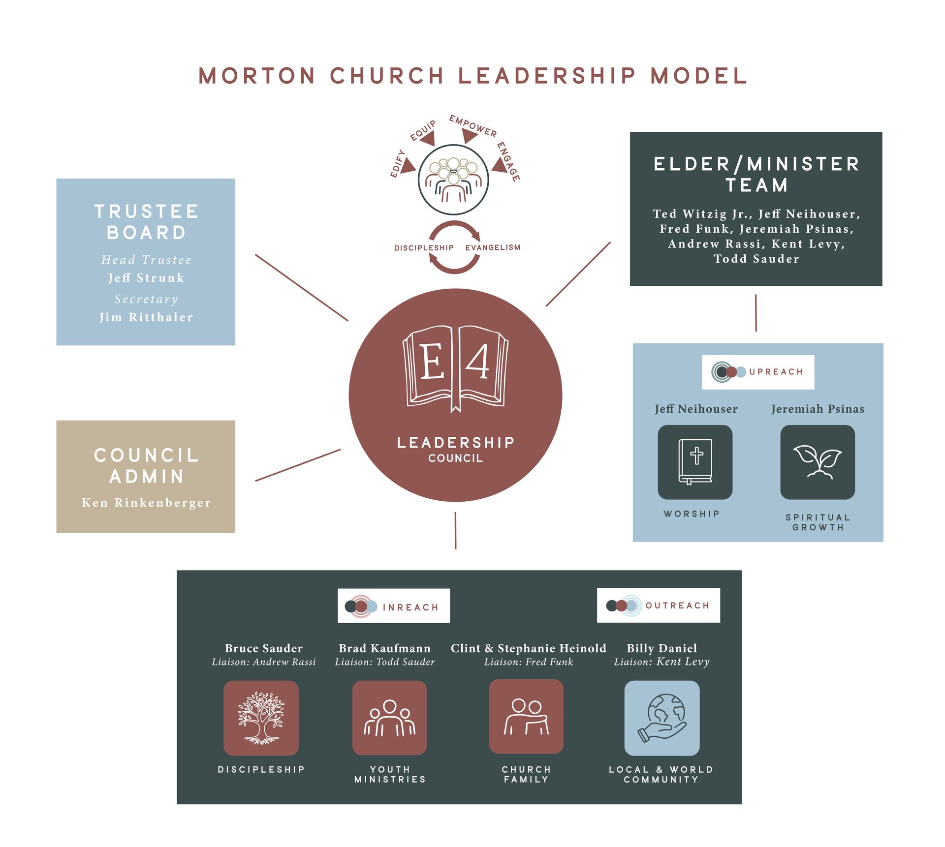 To the right is a visual representation of the new E4 Leadership Model being implemented in our Morton church. E4 represents the principles of Ephesians 4 – to edify, equip, empower, and engage the church to disciple and evangelize. The E4 Leadership Council is an advisory body whose purpose is to foster more effective collaboration and communication between different ministries of the church. It is comprised of the Elder/Minister Team, two Trustee Board officers, the Ministry Area Leads for the six Ministry Areas, and an E4 Administrator.